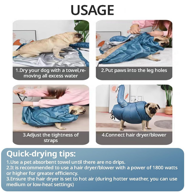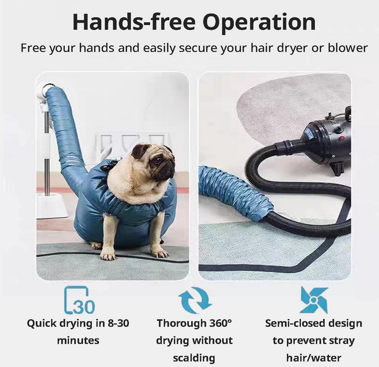 Eficiente y ahorro de tiempo: con un tiempo de secado rápido de 8-30 minutos, nuestra bolsa de secado circula uniformemente el aire, garantizando un secado completo sin riesgo de quemaduras. El diseño semi-cerrado evita que el cabello y el agua se dispersen, haciendo que la rutina de aseo de tu mascota sea muy fácil.